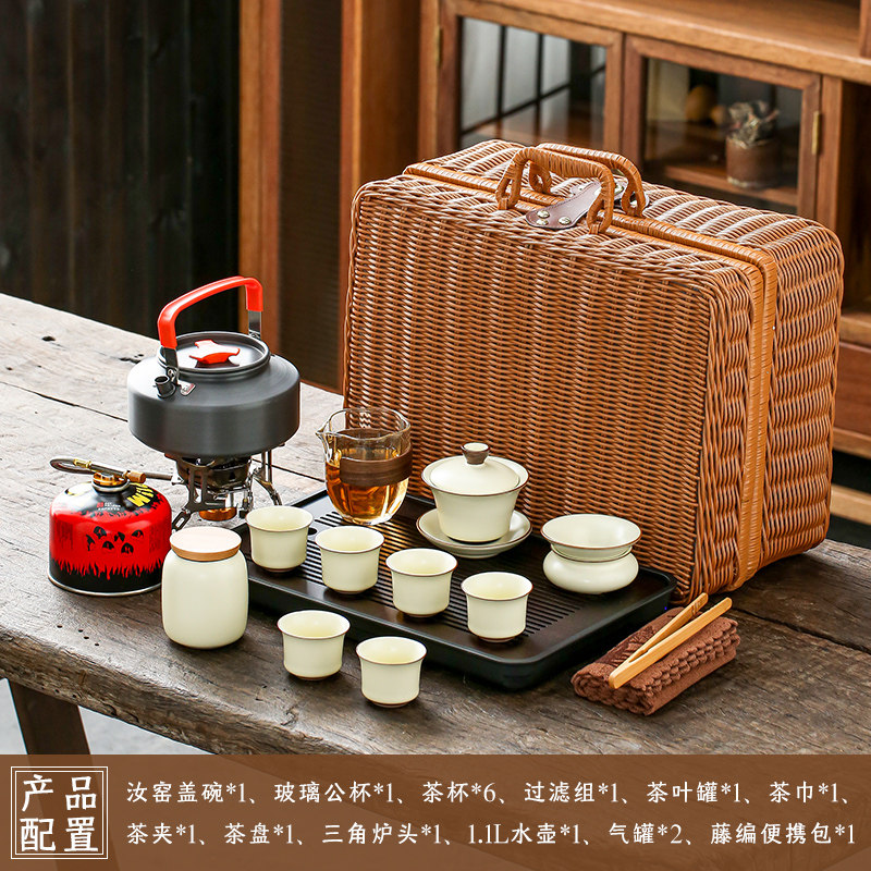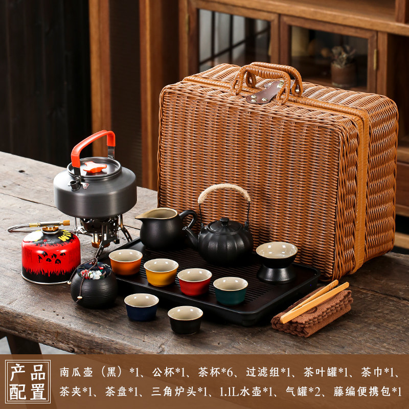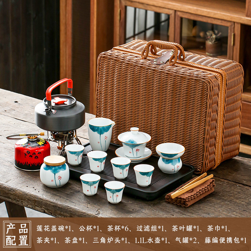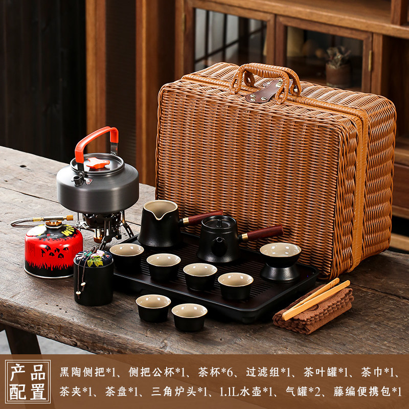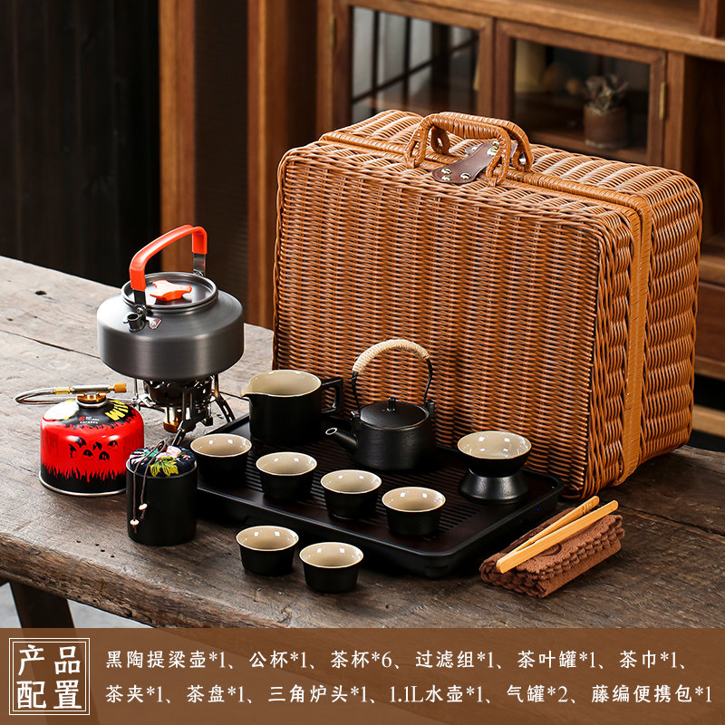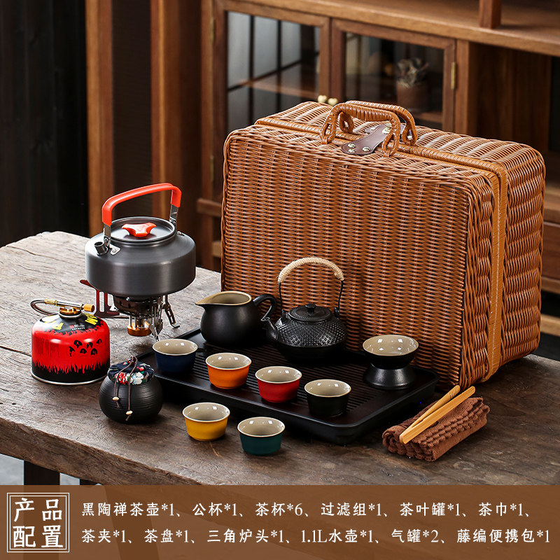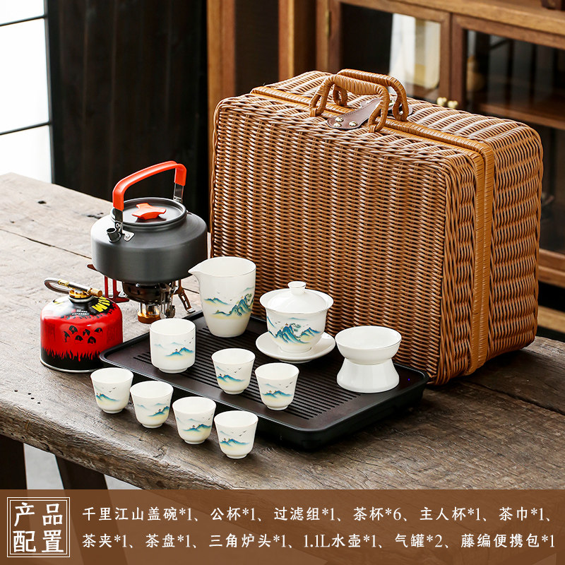> 户外手绘旅行茶具烧水泡茶装备套装露营野炊炉具泡茶壶高端藤编包