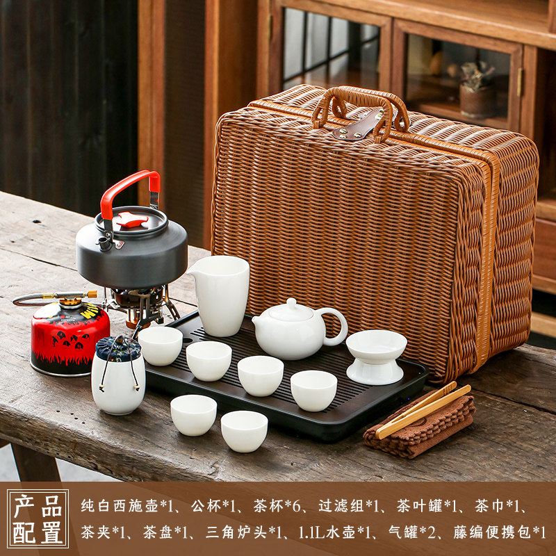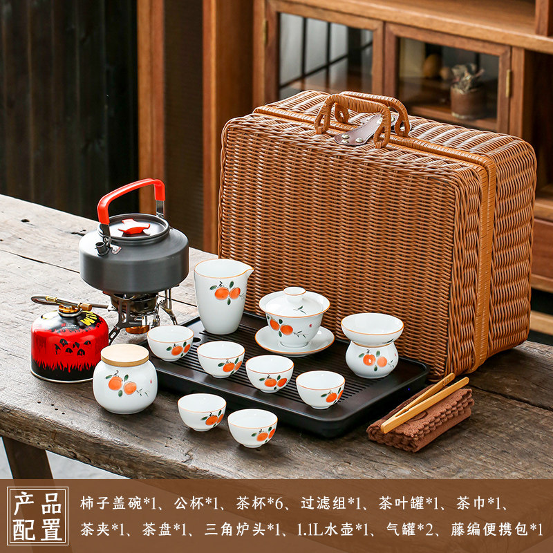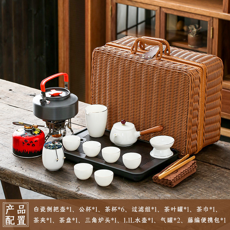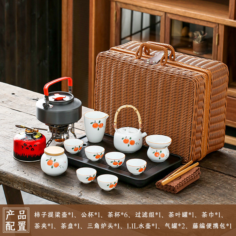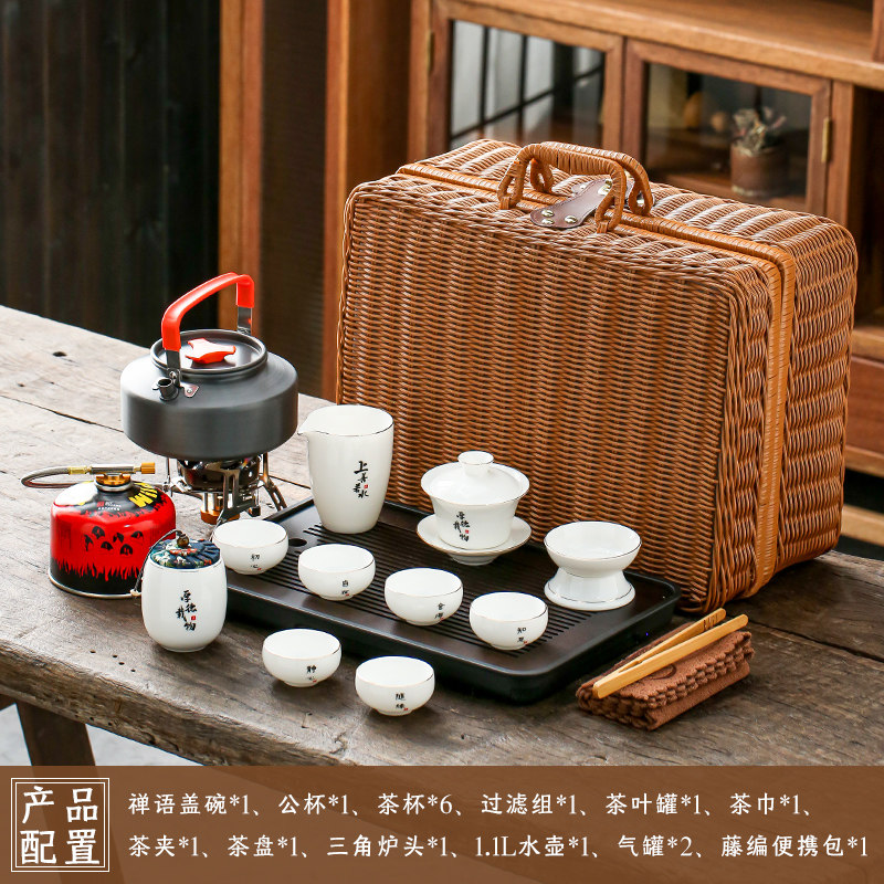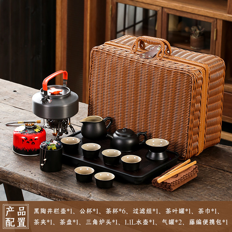 > 户外手绘旅行茶具烧水泡茶装备套装露营野炊炉具泡茶壶高端藤编包