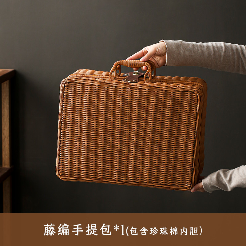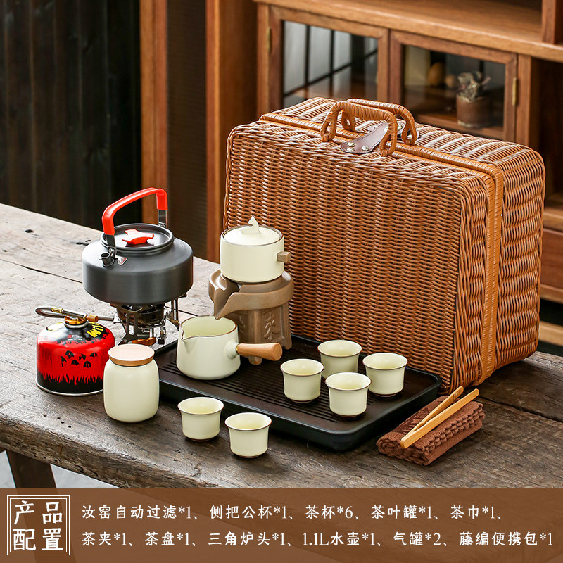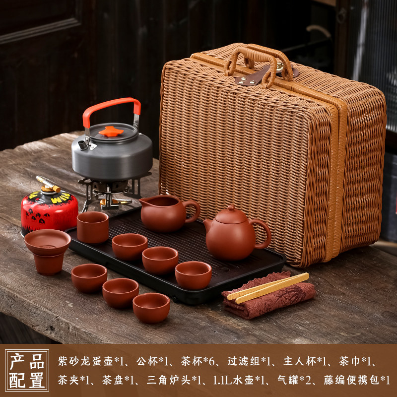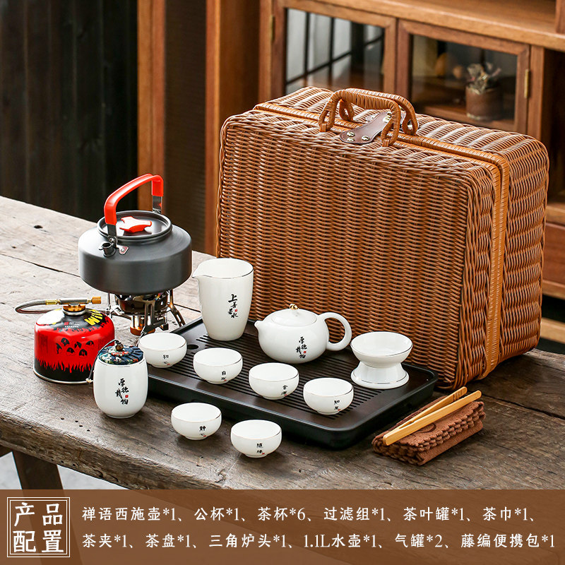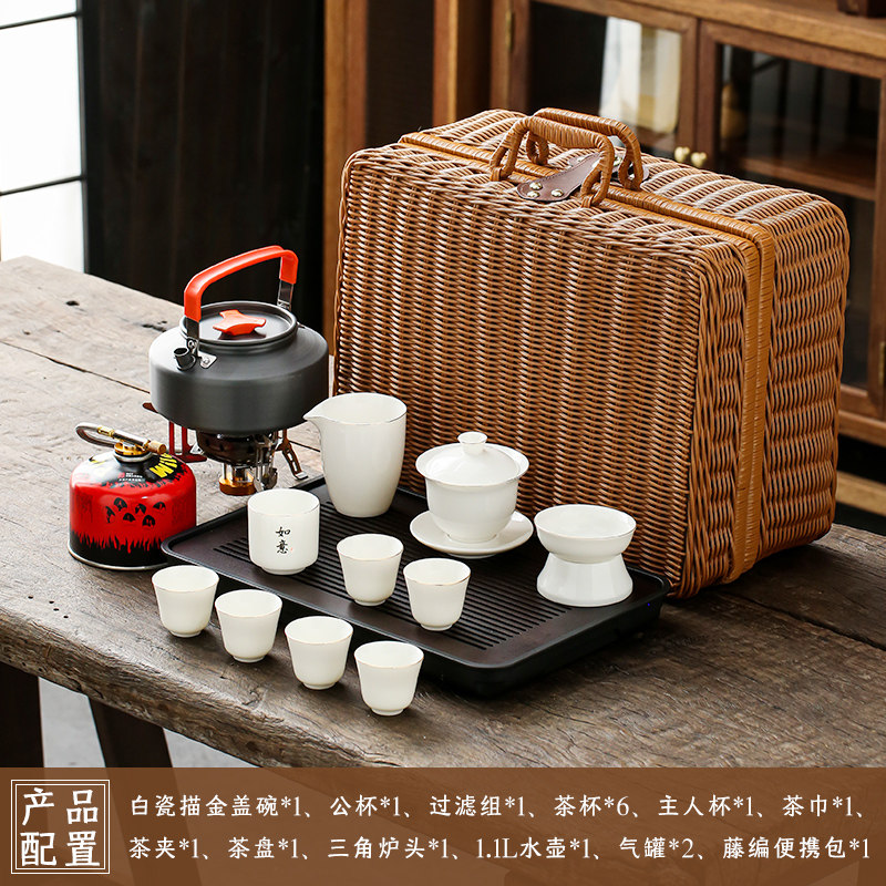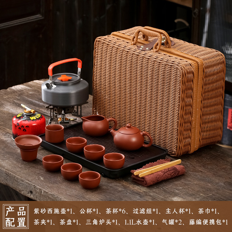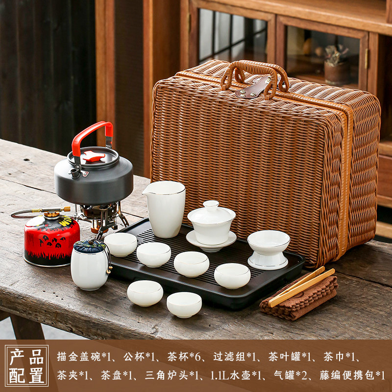 > 户外手绘旅行茶具烧水泡茶装备套装露营野炊炉具泡茶壶高端藤编包