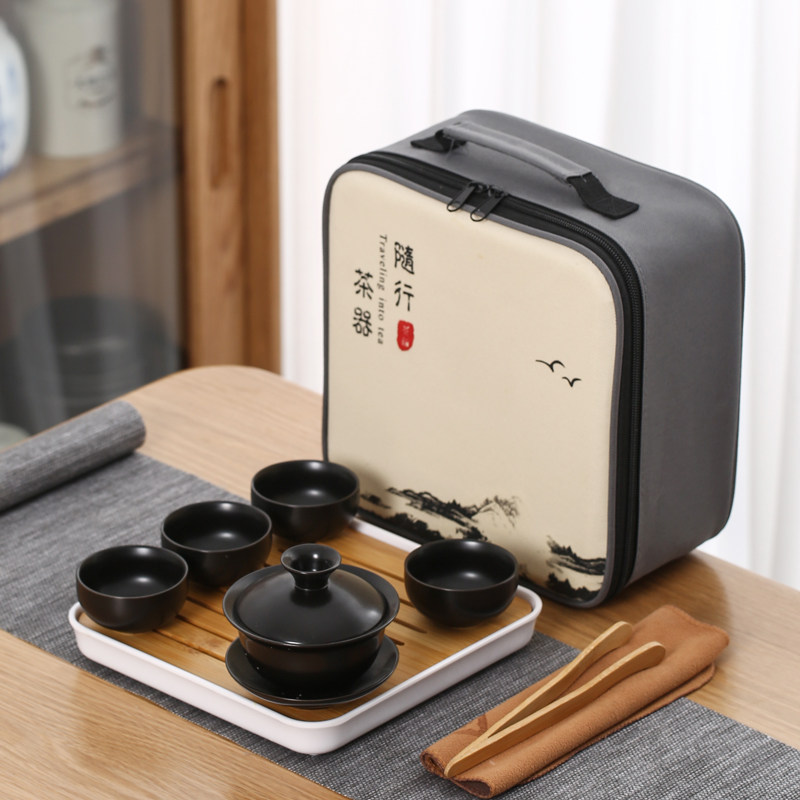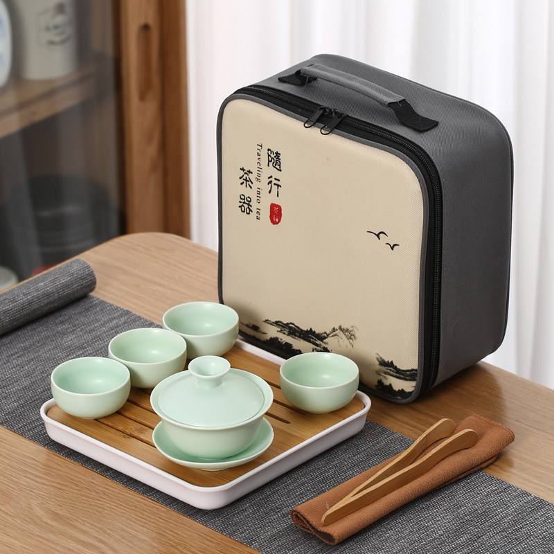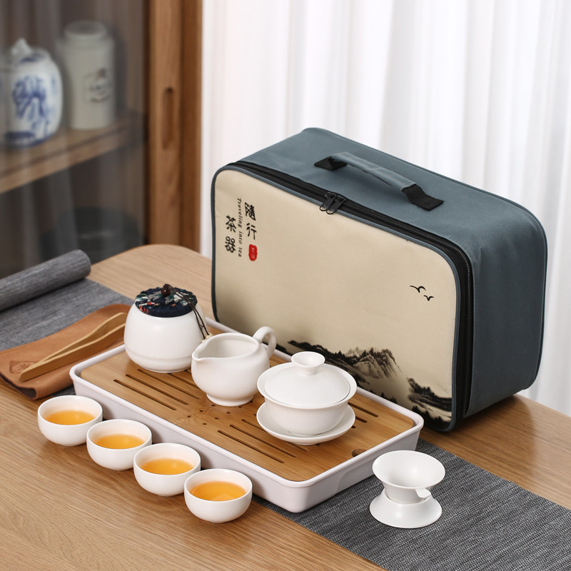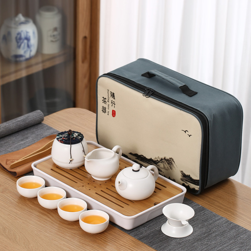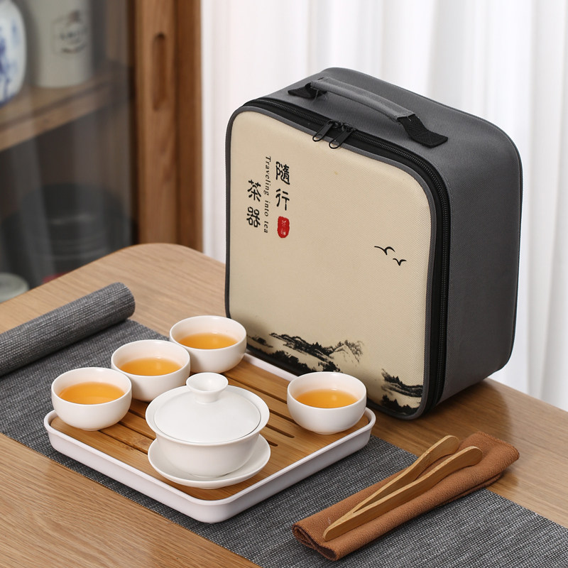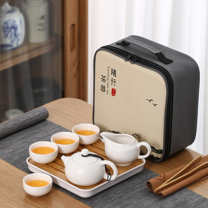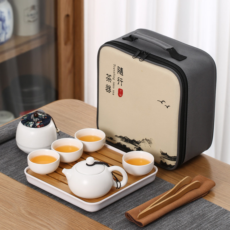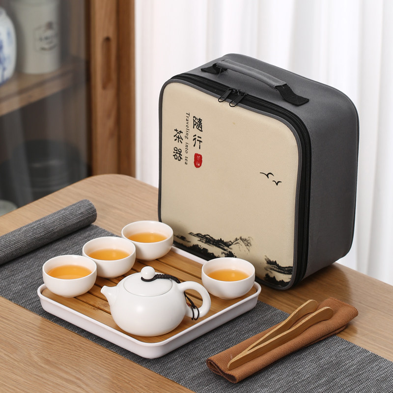 > 旅行茶具陶瓷一壶四杯小套装便携式户外露营盖碗茶杯车载泡茶壶