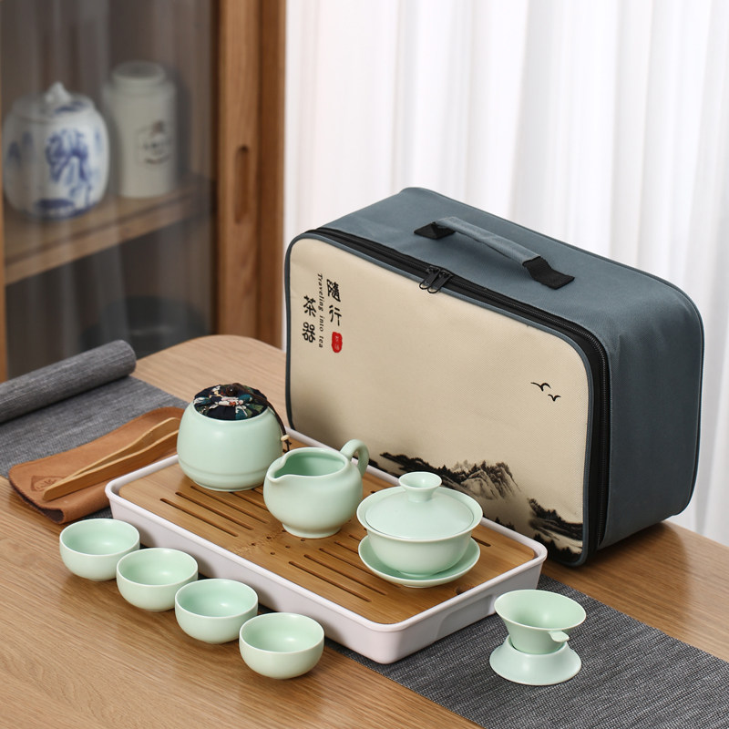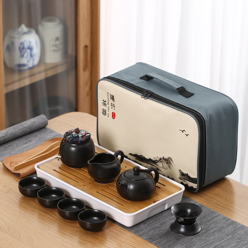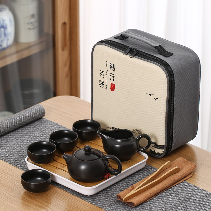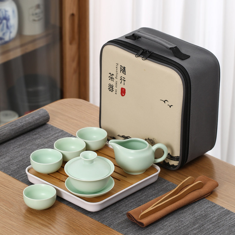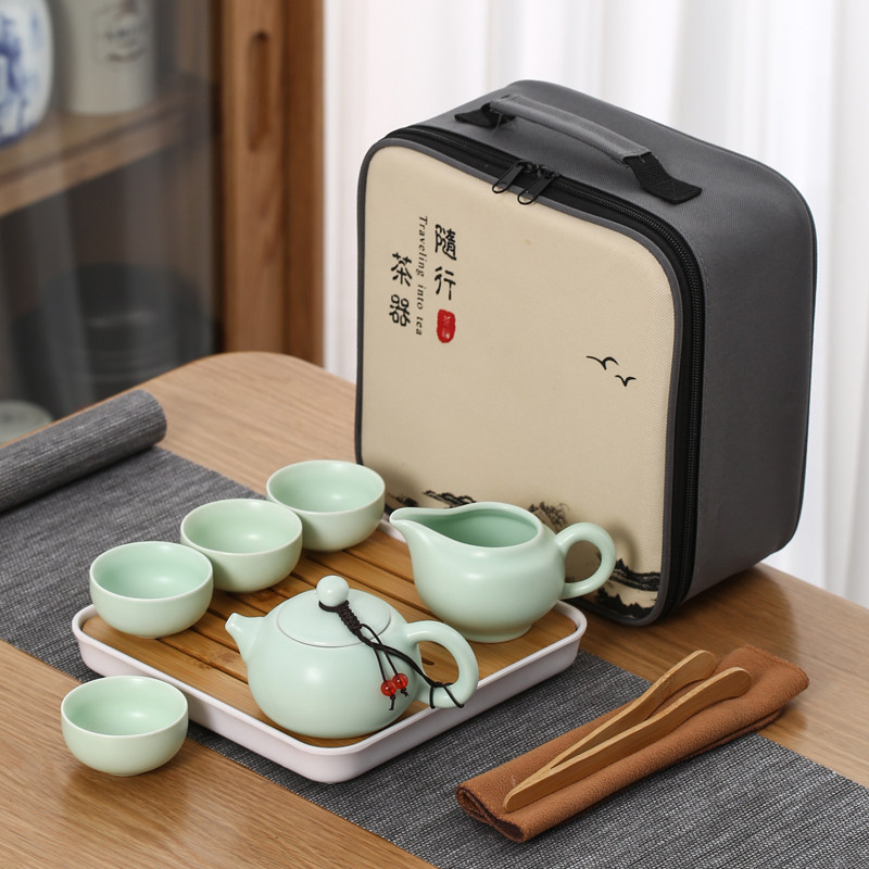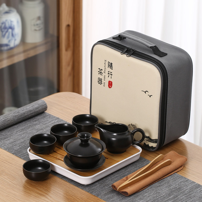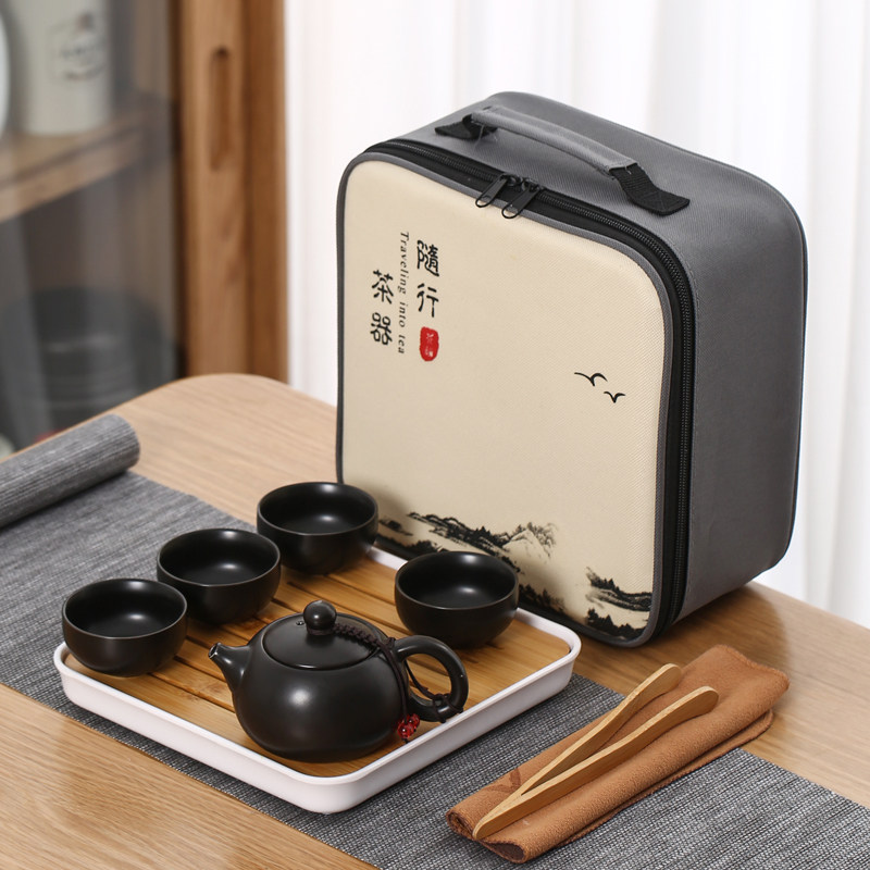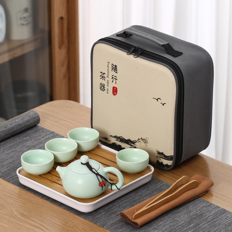 > 旅行茶具陶瓷一壶四杯小套装便携式户外露营盖碗茶杯车载泡茶壶
