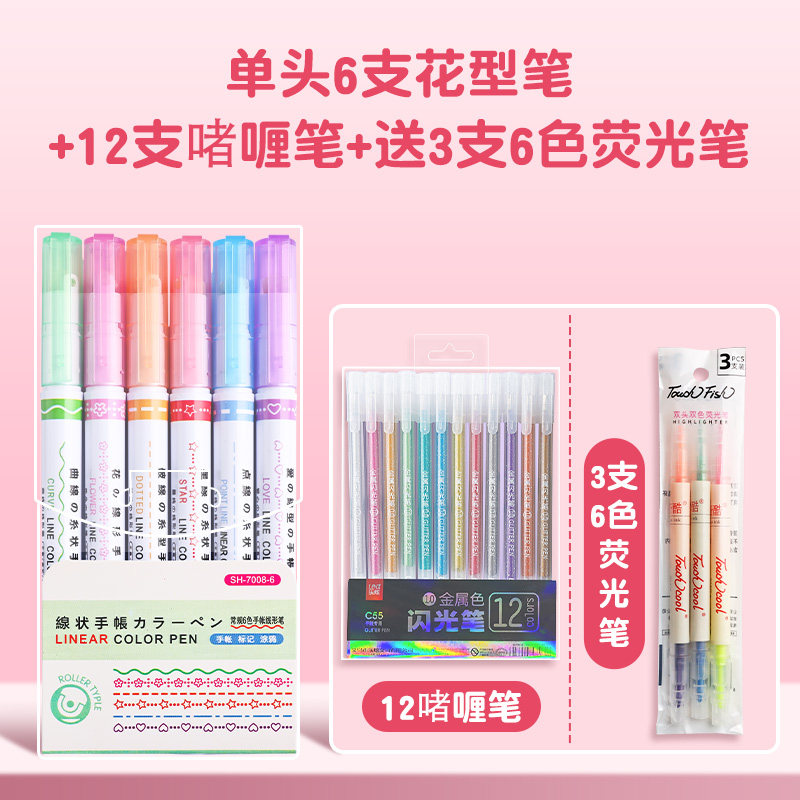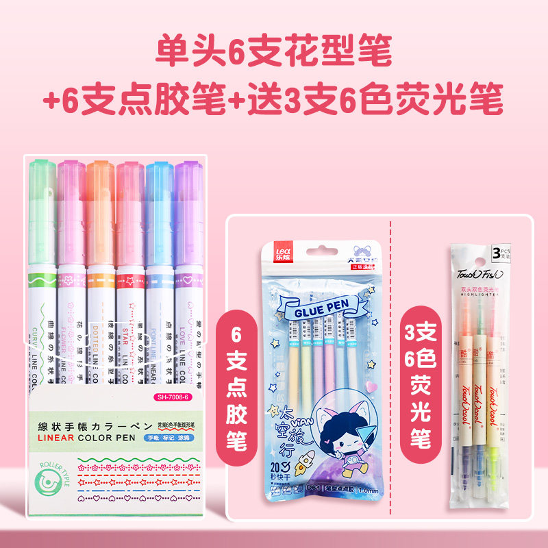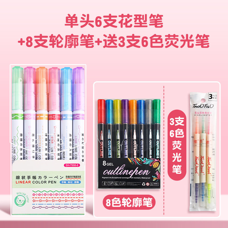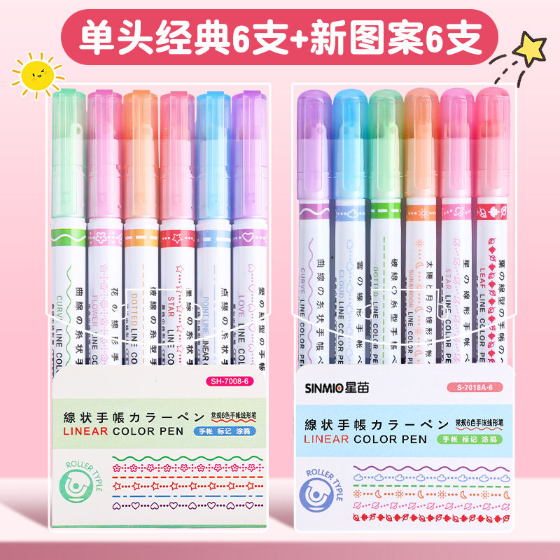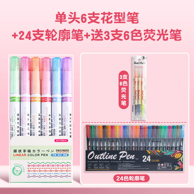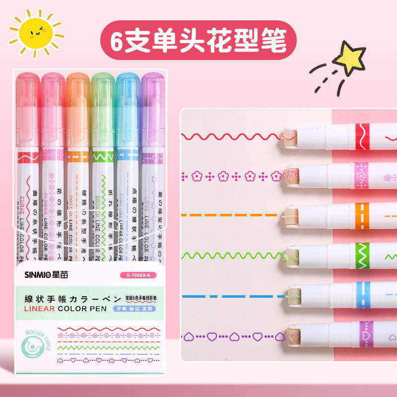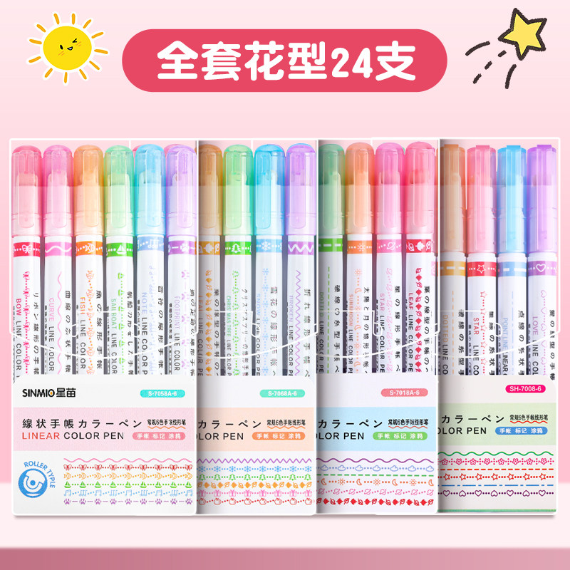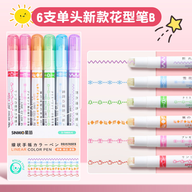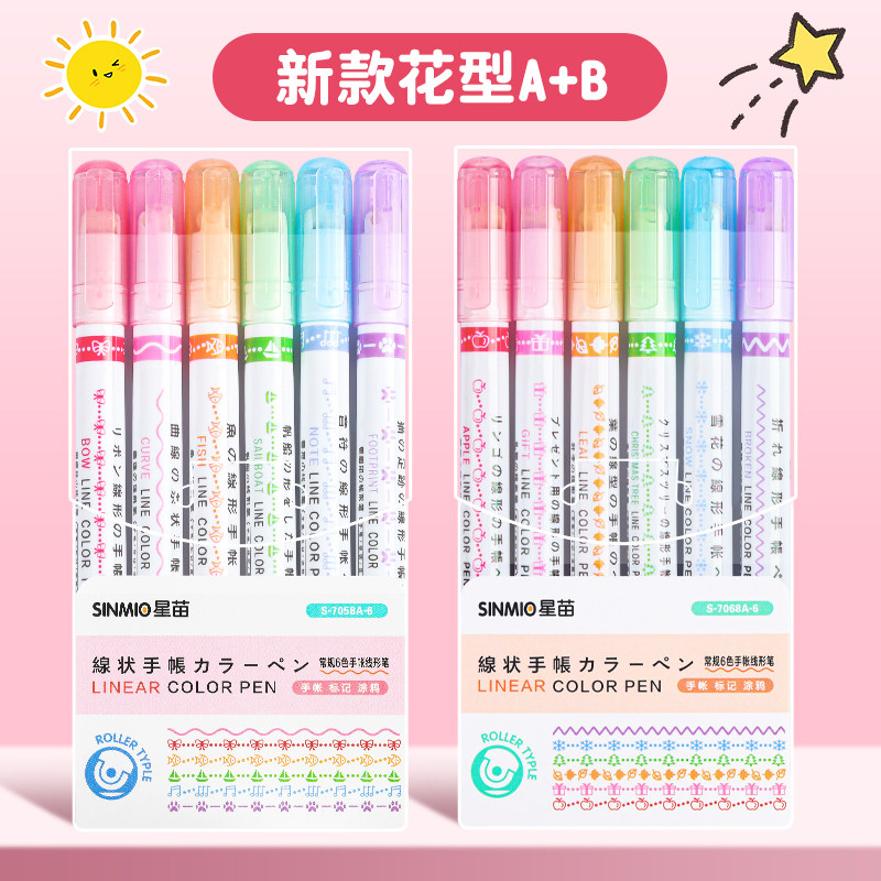 花型轮廓曲线笔手帐图案彩色标记花纹荧光色手账多色笔儿童花形多功能花边花色记号手抄报专用印花线条滚轮笔